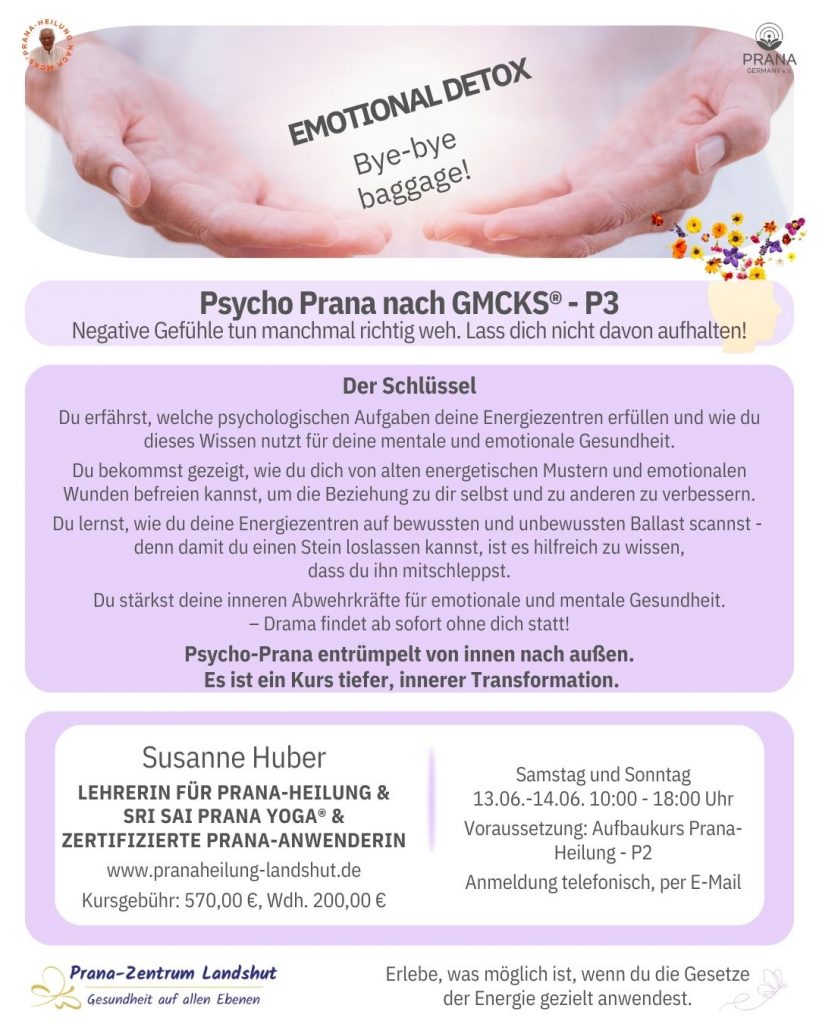 Gesundheit – auf allen Ebenen unseres Daseins – körperliche Fitness und Leistungsfähigkeit – geistiges Wohlbefinden und Ausgeglichenheit – Das ist Prana-Heilung! Die Menge an Lebensenergie, die uns zur Verfügung steht, beeinflusst unsere Gesundheit und Leistungsfähigkeit. Je mehr Energie wir haben, desto widerstandsfähiger sind wir gegen Krankheit und Stress, desto wohler fühlen wir uns in unserer Haut und desto mehr Power haben wir im Alltag. Prana-Heilung ist eine berührungslose Methode, die jeder leicht lernen und für sich nutzen kann. Wir können damit völlig ohne Berührung und ohne Nebenwirkungen unsere Energiebatterien wieder aufladen und die Selbstheilungskräfte in Schwung bringen.